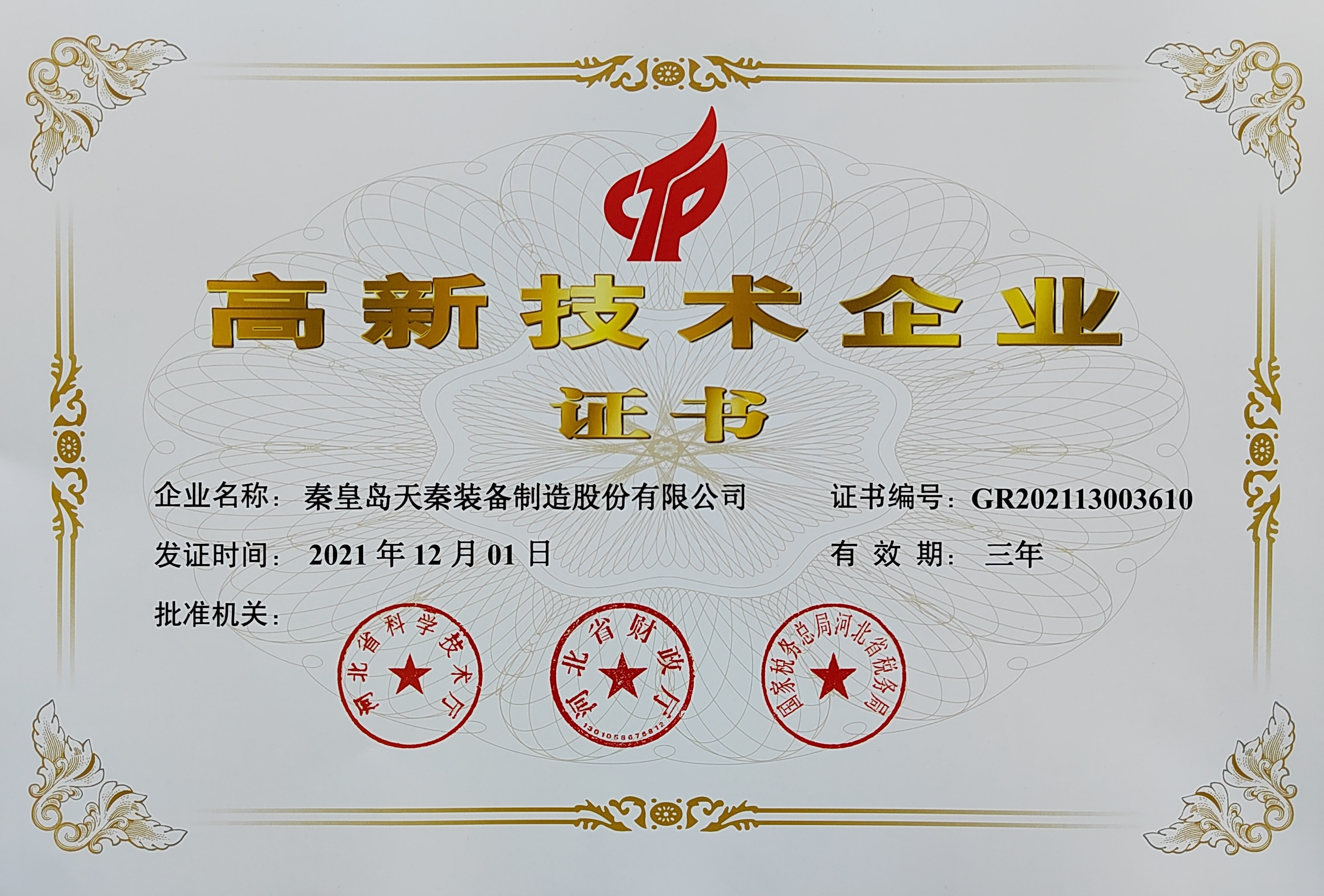 - 秦皇島天秦裝備制造股份有限公司創(chuàng)立于1996年,總部位于河北省秦皇島市經(jīng)濟(jì)技術(shù)開發(fā)區(qū),秦皇島廠區(qū)占地4萬(wàn)平方米,擁有3萬(wàn)平方米的標(biāo)準(zhǔn)廠房、辦公樓和工程技術(shù)研發(fā)中心;分部天津廠區(qū)位于天津市靜海經(jīng)濟(jì)開發(fā)區(qū),占地2萬(wàn)平方米,擁有1.6萬(wàn)平方米標(biāo)準(zhǔn)廠房。 公司通過了GB/T 19001質(zhì)量管理體系及GB/T 24001環(huán)境管理體系認(rèn)證,是國(guó)家高新技術(shù)企業(yè)、河北省軍民融合產(chǎn)學(xué)研用創(chuàng)建基地,建有省級(jí)院士工作站。